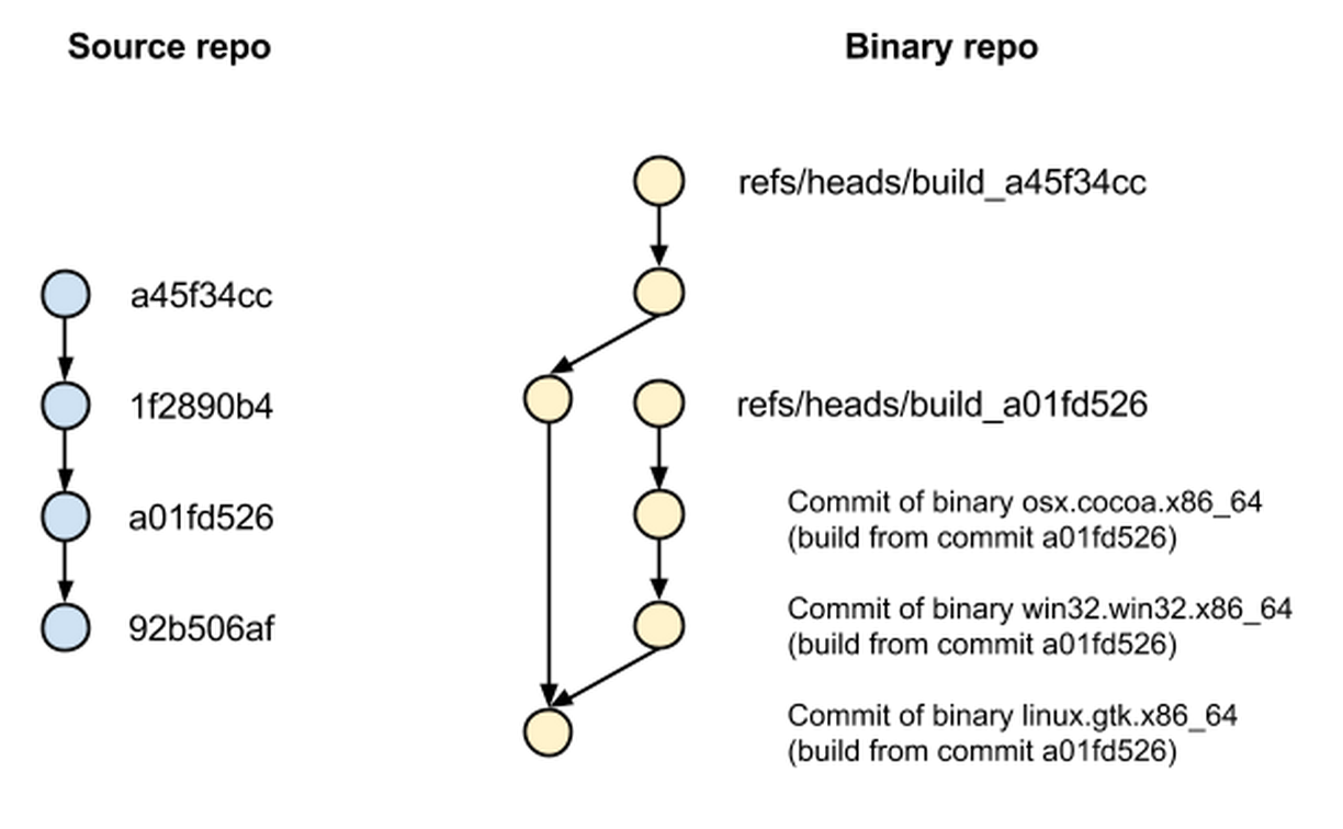 What about using git branches to sync up builds? Today, all binaries are committed in a single commit and then tagged, and that make the sync quite obvious. What about using a git branch where all the platform binaries will be committed? The branch will match a commit in the source git repo and will then be the unit of synchronization. Picture is worth a thousand words so: