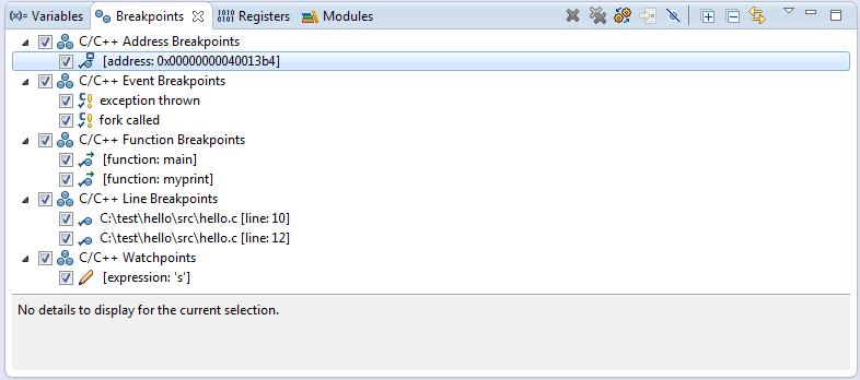 I noted that in Breakpoints View when you select any breakpoint, the detail pane is always empty.
