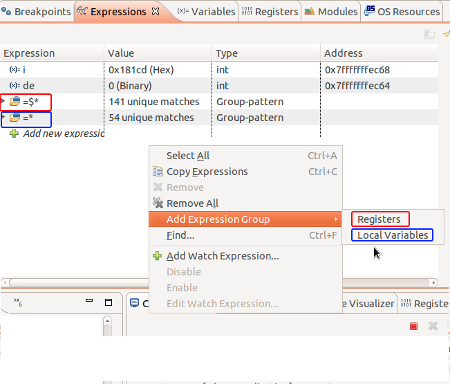 So I proposed to add menus to _expression_ view to add locals and registers groups.