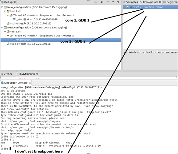 For embedded systemWhen debugging multicores, we may use multiple GDBs, and in this case, when you set breakpoint in one of the GDB's console, it will affect another GDB