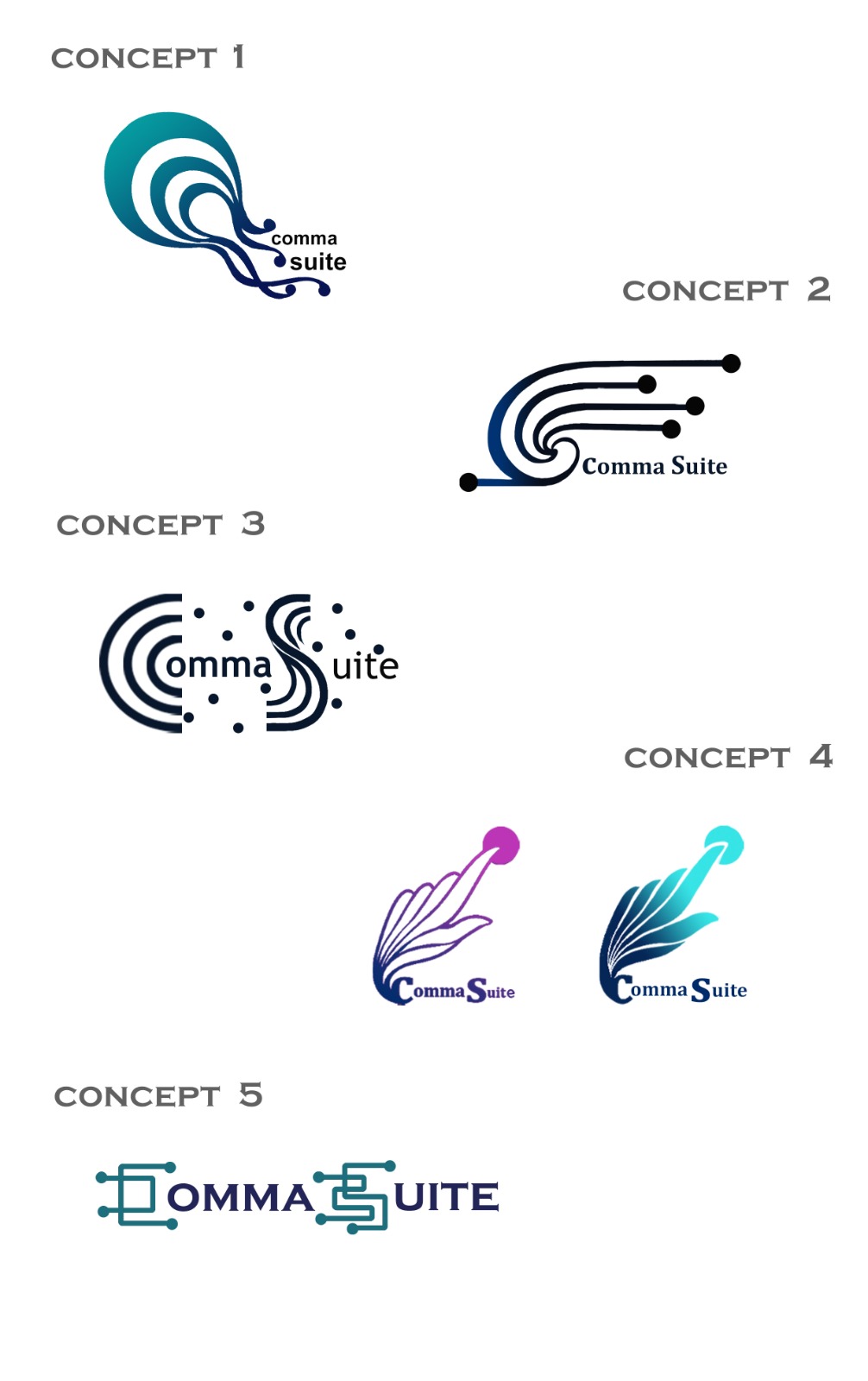 Below five concepts for a CommaSuite logo. Please let me know your opinion, e.g. logos you like / dislike / ranking / changes / …