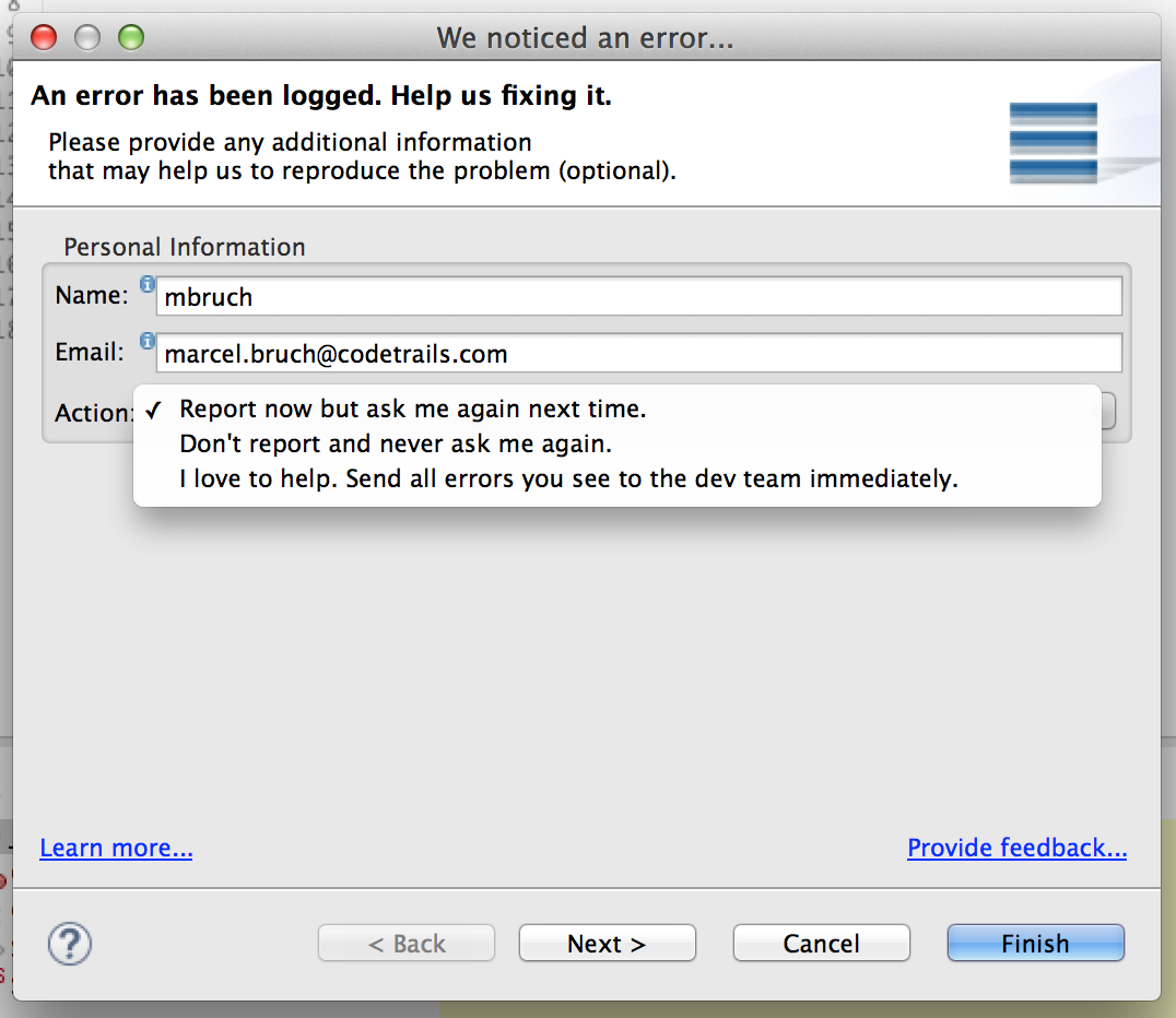 The intension is obvious I think. Errors happen (especially during the milestone builds). The sad thing is that it usually takes weeks until a user recognizes them as such and reports them to Bugzilla – if ever. To help us to get notified about issues in the current code base and fixing them as quickly as possible, I’d like to add a log listener to the platform log which automatically sends error log entries to a server at eclipse.org.