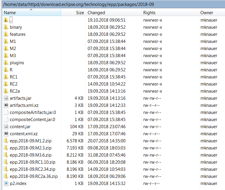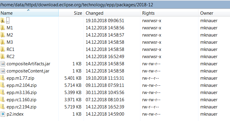 I.e., the repo changes from being a composite to being a simple/aggregate.   That can of course happen tomorrow (changing the p2.index and making the artifacts/content files visible) but at some point very soon (today) the binary, features, and plugins folders should be populated so that mirrors have a chance to mirror those folders before users start using the repo tomorrow.  Otherwise, users installing with the installer will install RC1 (if the repo doesn't change at all before tomorrow) or they will need to download directly from download.eclipse.org for lack of mirrors, possibly bring the server to its knees.