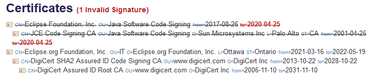 Fortunately all these jars are signed twice, where the second signature is valid: