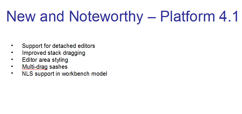 The New & Noteworthy list for Platform 4.1 in the release review slides is a little sparse. I know tons of work happened, so if there is anything more we can add here please let me know: