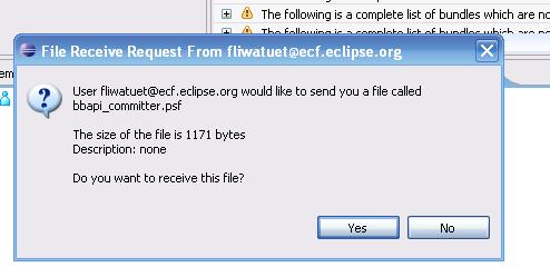 And if you choose 'Yes' it will give you an opportunity to put the file in a location of your choosing and then transfer the file.  No progress indicators on either side yet, but that can be added later (in org.eclipse.ecf.ui.RosterView for those curious).