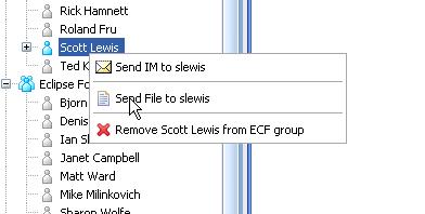 On a bit of whim today I implemented a very minimal user interface within the existing RosterView  for sending/receiving file transfers via the ECF filetransfer API (the IOutgoingFileTransferContainerAdapter...i.e. for user initiated file 'sending' rather than file retrieval).