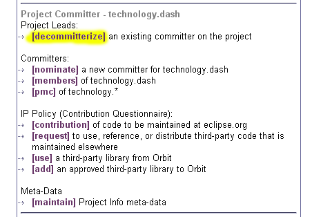 One thing that a couple of people have mentioned is that they have left some people on the lists to acknowledge their past contributions even though they are currently not active. For example: John Weigand. While this is admirable, it is not allowed by the project Charters - but all is not lost! - we have added a new "Committer Emeritus" feature to the project information pages (bug 222350 <https://bugs.eclipse.org/bugs/show_bug.cgi?id=222350> ). The [decommitterization] form has a checkbox for you to nominate significant past contributors for Emeritus status. There is no limit to the number of Committers Emeritus a project can have, but this role should be a honor reserved for significant contributors.