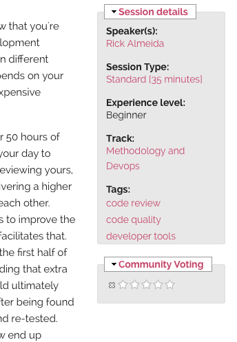 A quick note to say that community voting is now deployed on the eclipsecon.org/na2016 website. For now, only admins can see it, but we will start to promote it this week and the week after, so it will be active for any logged user very soon. See below a screenshot for the final look. The grey X is to cancel the vote (back to 0 stars).