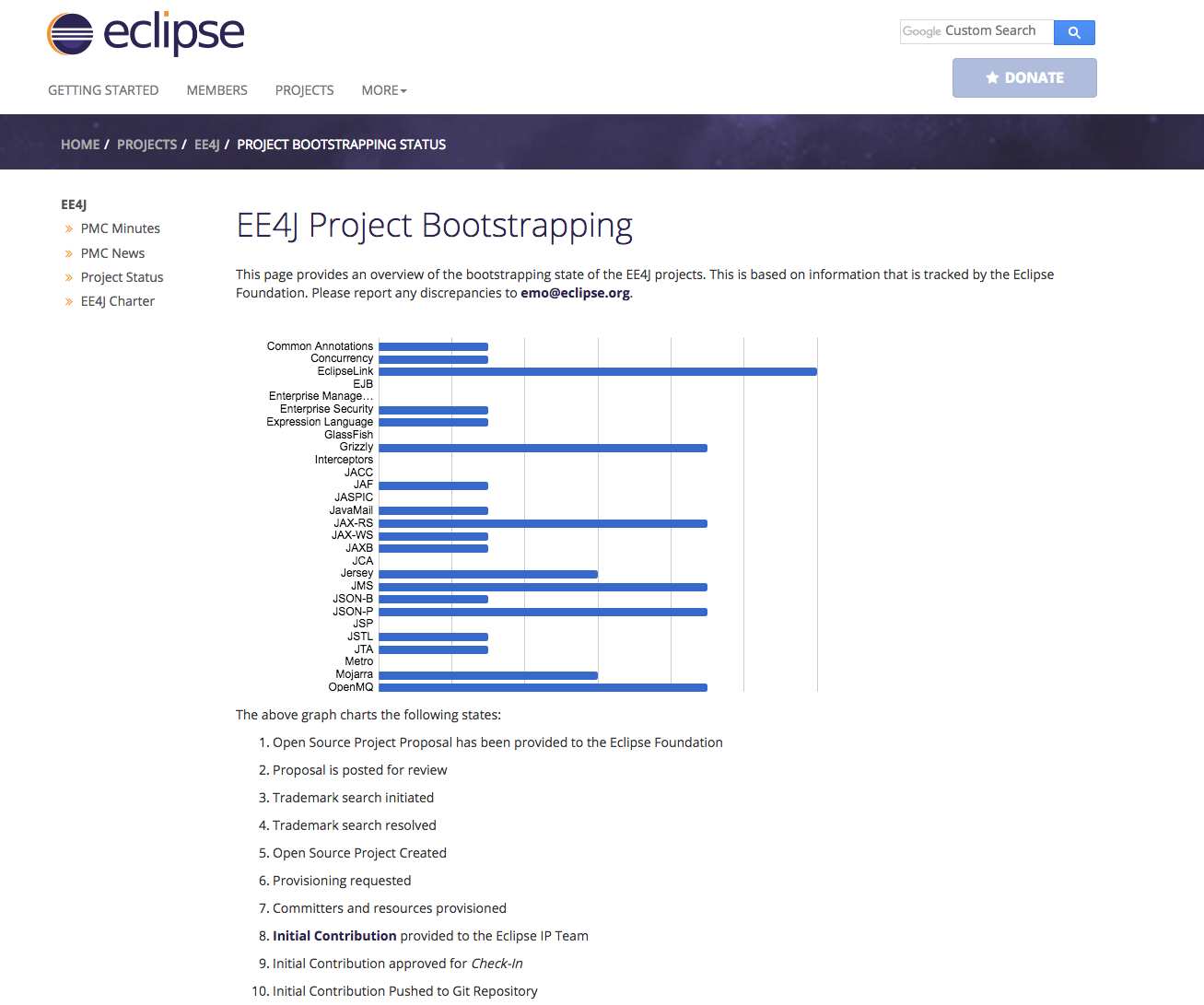 Note that I think in terms of projects, not any particular sort of technology. This chart lists the open source projects that we expect to be moved to the Eclipse Foundation. Some of the more stable APIs and RIs will be absorbed by one of these projects (that's currently pending).