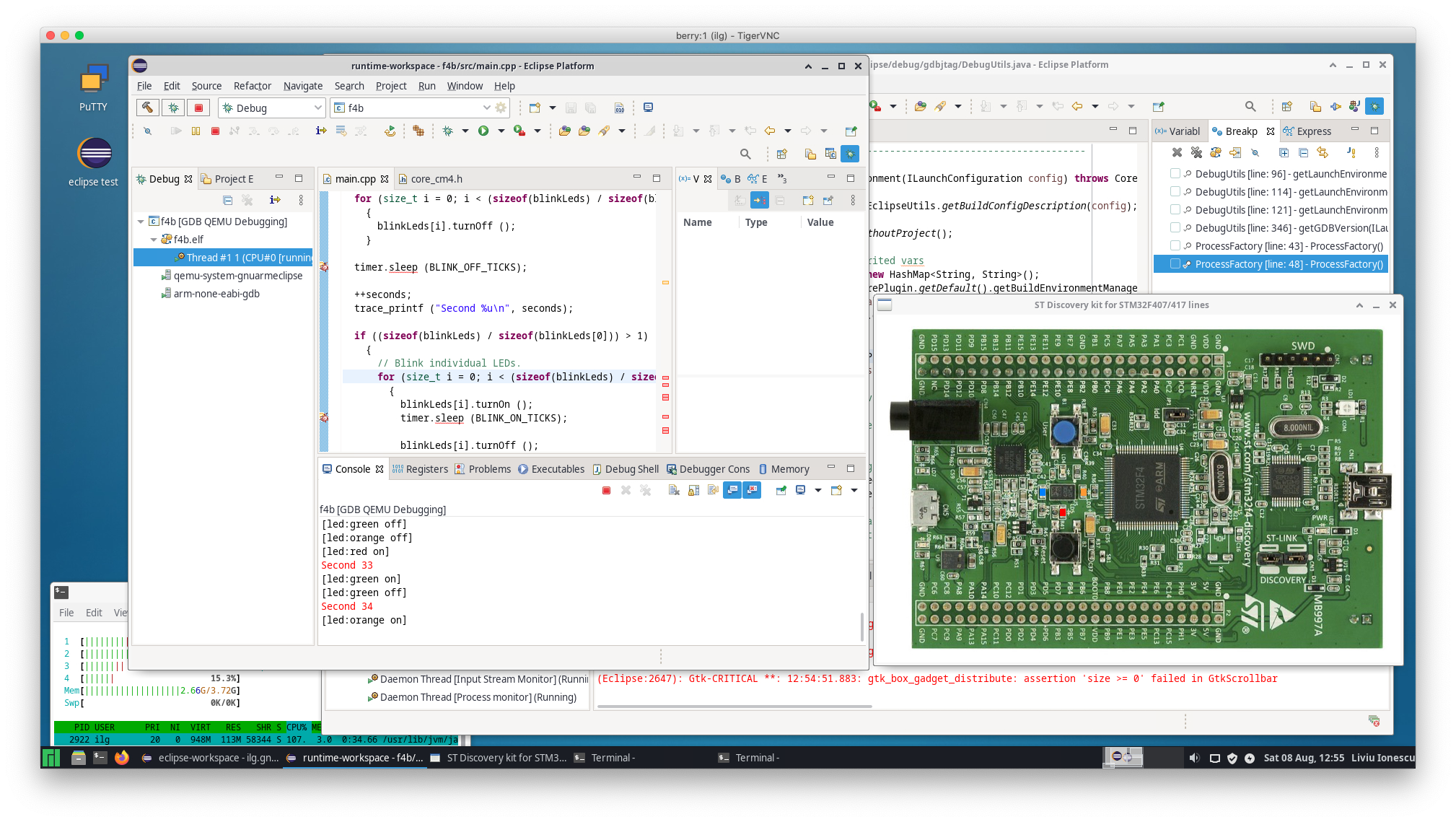 The Eclipse on the left was started in debug mode by the bottom Eclipse, where a test CDT archive provided by Jonah was imported, compiled and integrated with the Embedded CDT plug-ins.