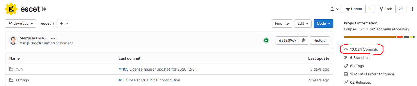 I noticed that we've got now over 10K commits in the Eclipse ESCET repository, since our initial contribution (see red encircled in screenshot below). This concerns only commits in the 'develop' branch, our main branch. A nice milestone 😊.