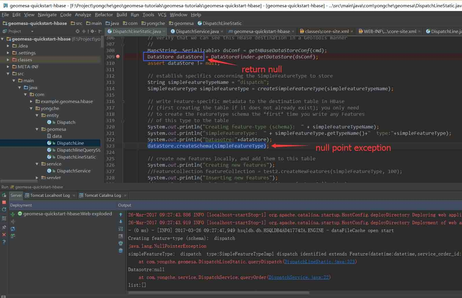 When I use the geomesa-quickstart-hbase example,It works very well,but when I transform the project to a java web project and call the queryFeatures method  used a servlet doGet method, It has an error that the DataStore return null,and dataStore.createSchema(simpleFeatureType) method return a nullpointException.