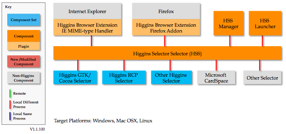 • Selector – client code that manages identity information using the information card metaphor. A selector is used to disclose identity information to a relying site or a local application for authentication or other purposes. The HSS can launch one of the Higgins selectors or it can launch CardSpace™ as the user desires.