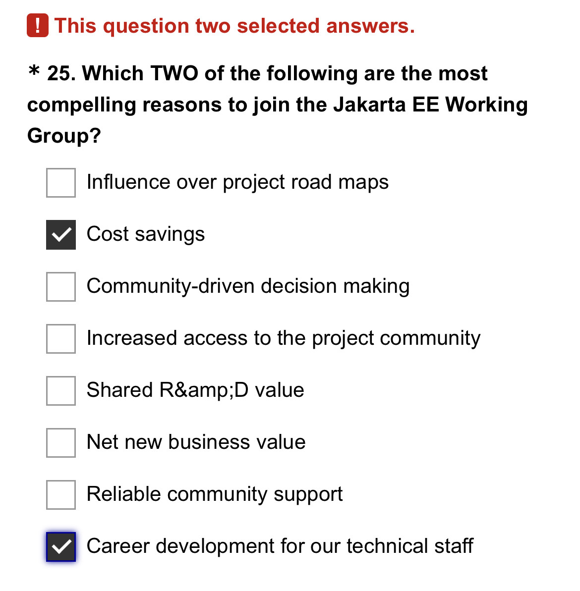 I can't seem to get answers for question 25 accepted. Even if I select 2 the survey complains.