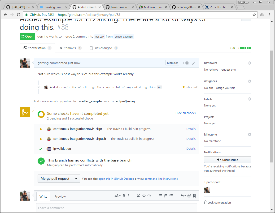 Master is still not protected. To do this go into ‘Settings’ and force the checks to pass before allowing a merge. You can see below that I could merge the comment with no checks passed if I chose.
