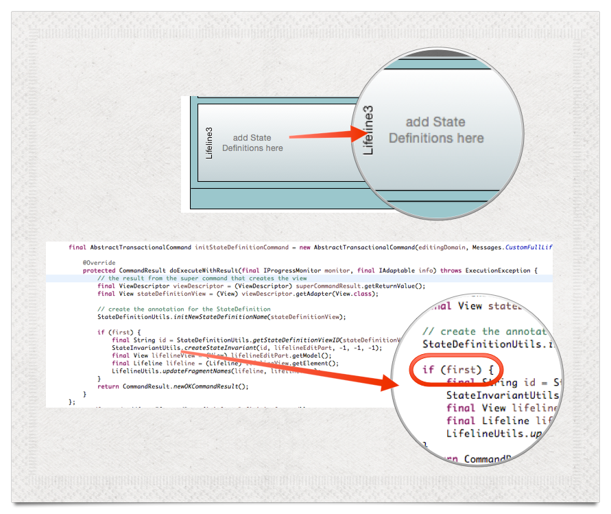 The diagram, itself, suggests by the use of a plural form that one should be able to create more than one (see below).  However, in the CustomFullLifelineStateDefinitionCompartmentCreationEditPolicy class responsible for creating state invariants, the code is clearly creating a state invariant in the model only if it would be the first one covering the lifeline (see below).  If there is already a state invariant, then this edit policy creates only a view for the next one, without a semantic element to back it (which actually results in an NPE that I have “fixed" in my workspace).