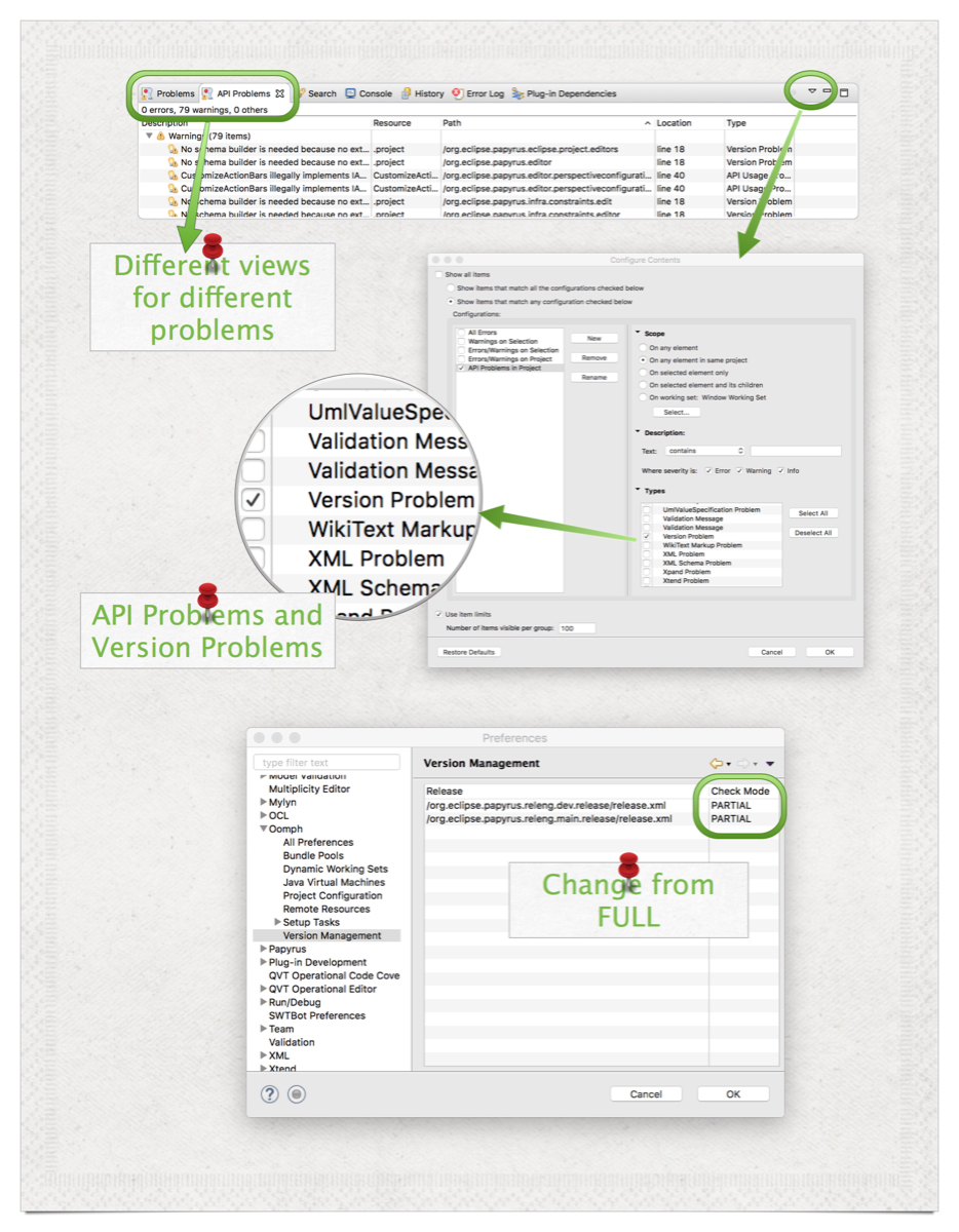 Also, I thought I might share how I distinguish API Problems from compilation and other problems.  I create a second Problems View instance configured to show just the “API Problems” from PDE and the “Version Problems” from Oomph, and I exclude those from the original Problems View.