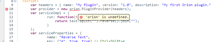 Orion uses eslint to find errors in _javascript_ code.  You can add a global declaration to your file and it won't mark orion as an error.  See http://eslint.org/docs/configuring/