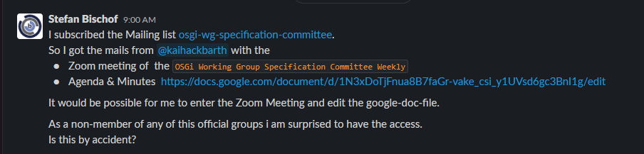not sure if anybody has seen Stefan Bischofs message in Slack, but it seems that he managed to simply subscribe to this Mailing List and has full access to everything. Yes we are Opensource, but should we be that open?