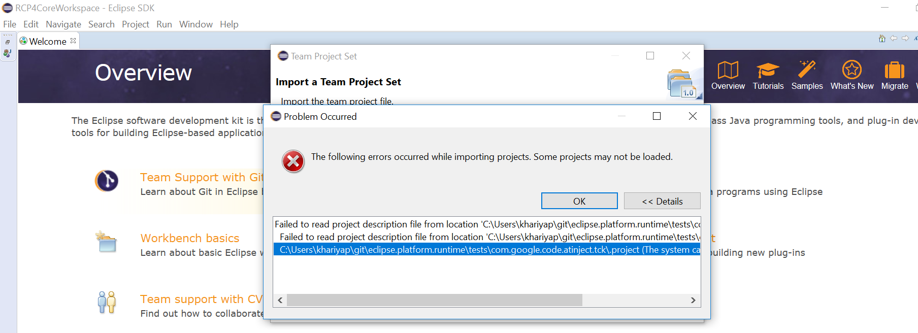 Step 3 : Get the code for Platform UI. Got the error like "Failed to read project description file from location 'C:\Users\khariyap\git\eclipse.platform.runtime\tests\com.google.code.atinject.tck\.project'.