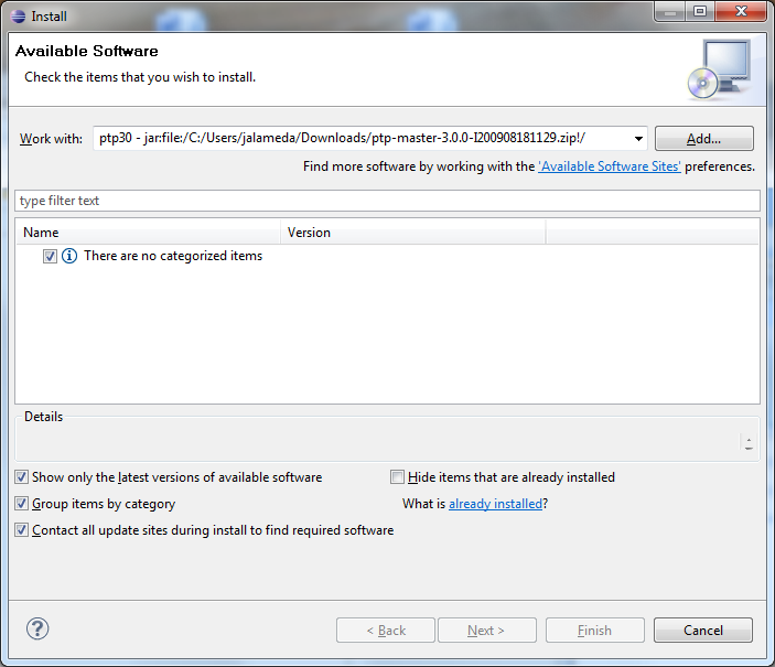 I am trying to install the August 18 build - I200908181129 of PTP, but, when I go to work through the wizard, rather than getting a choice of components to install, I get a message saying