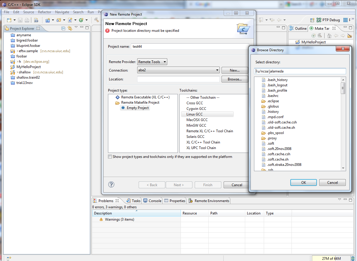the first pane of the functional new project wizard allows me to indicate the remote provider (eg, remote tools ssh connection to abe.ncsa.uiuc.edu); and **at that point** I can select the location of the remote RDT components…