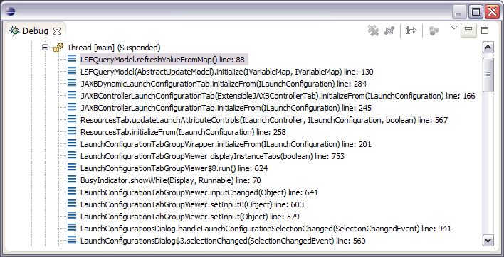 Then I open the same run configuration a second time with the following trace. The first thing that happens for each attribute is that refreshValueFromMap() is called twice for each attribute. For LSF_QUEUE I see that the first time 'night' is retrieved from the map. Then refreshValueFromMap() is called again and this time the value retrieved from the map is null. It seems like something is rewriting the map. This is where I'm wondering if there's some sort of problem with the handling of the text widget and my custom widget which both reference and set the LSF_QUEUE attribute.