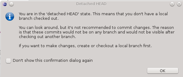 Now I'm trying to follow the steps for revising a patch as described in Part 3 on the Gerrit wiki page. I clicked Team->Remote->Fetch and entered 20637 (from the Gerrit URL https://git.eclipse.org/r/20637) and hit CTRL-space. This changed the value to 'refs/changes/37/20637/1/ I clicked 'Checkout FETCH_HEAD since the wiki page says checkout shuold be sufficient and clicked OK. That got me a popup as shown below.