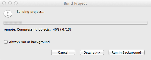 I am trying to build my synchronized project (about 37 files).  It has been working fine for days, but now it hangs at the Build Project on Compressing Objects (see attachment).  Any idea what I should do about this?