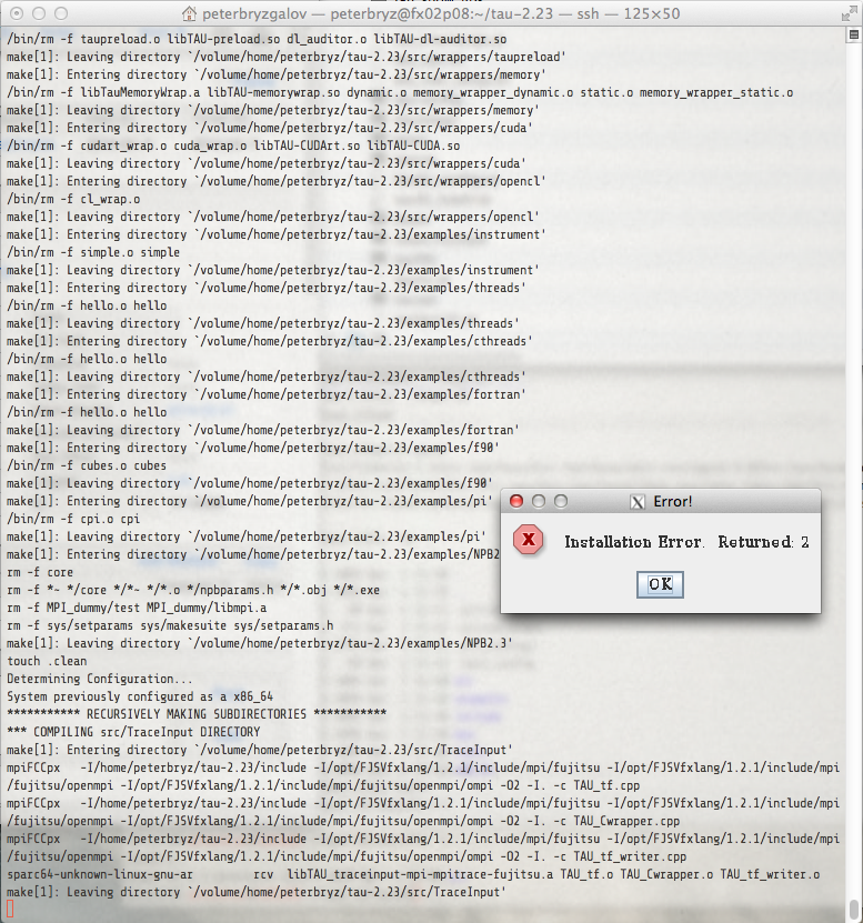 I am compiling TAU at a login node of FX10 supercomputer. FX10 is a smaller computer similar to K, with Fujitsu SPARC CPUs on compute nodes.