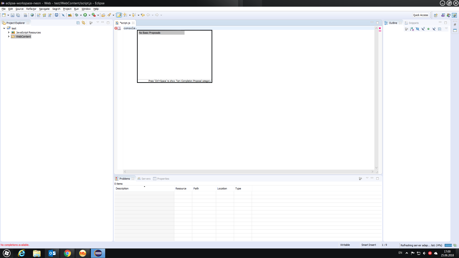 Hello, dear eclipse users. I'm a web developer and I need an IDE with _javascript_ html css and php support. But it seams that since Mars3 version _javascript_ support does not work in eclipse. I mean Content assist does not offer me autocompletion in _javascript_ files. Is it a bug? Is there some solution to get _javascript_ support for free? There are solutions but they want money to be paid, e.g. CodeMix plugin.
