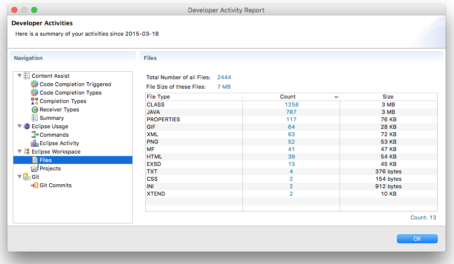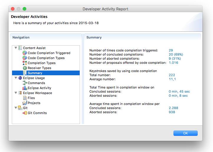 If you ever wanted to find out, how you use code completions, what commands you use most often, how much time you spent in Eclipse, Developer Statistics has the answer.