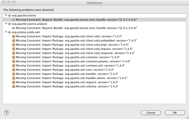 can you describe exactly what you did to get there? The problem quite certainly related to the target platform definition where for some reason the org.apachelucene.core bundle is missing. Did you add an Eclipse 3.7.1 SDK (exactly this version!) to  the target platform? It should contain this bundle.