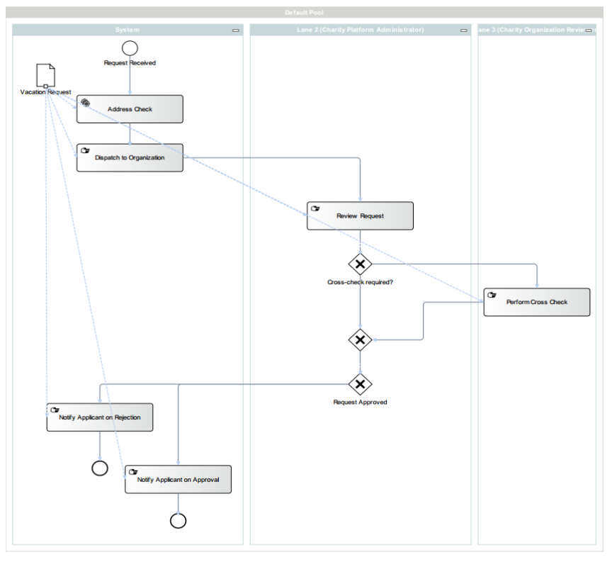 Application of an individual in need for funding, dispatching of this application to one of the charity organizations, analysis and approval steps (possibly 4-eyes-principle) and applicant notification.
