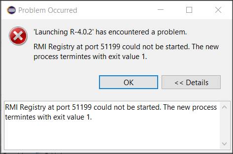 I am working with eclipse 2019-12 (4.14.0) under Windows 10 Pr0 (version 2004) with statET 4.1, R 4.0.2, and when I launch R, eclipse is hanging in the “Starting service registry (RMI) process” at 26%, as you can see in the figure below; What can I do to fix this problem?
