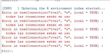 I have installed Microsoft R Open version 4.0.2, and I am trying to run it together with eclipse 2023-06. I have installed in MRO rj_4.0.1-4.zip and rj.gd_4.0.1-3.zip. When I launch MRO from eclipse all seems to work fine; message “[INFO   ] Updating the R environment index started...” appears as usual; but after 5 to 10 minutes, the message “Error in textConnection("rval", "w", local = TRUE) : all connections are in use appears, and I have to kill the process, as it can see in the figure below.