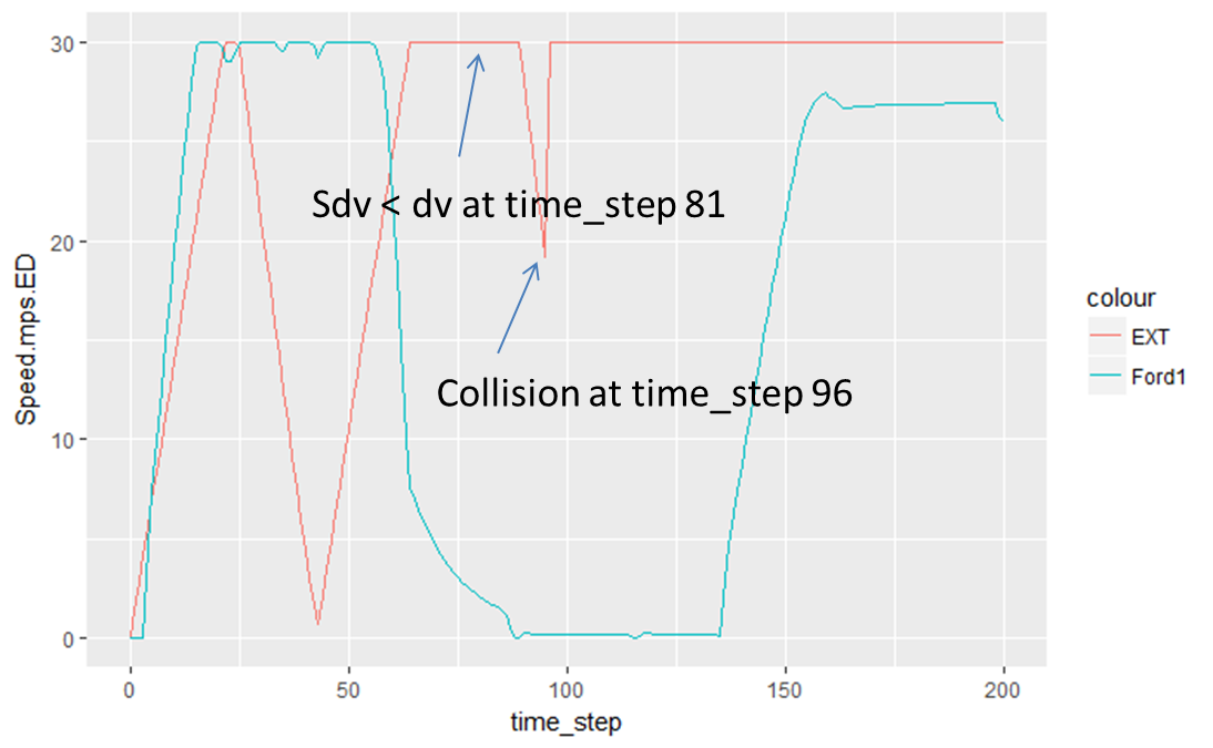 According to my manual calculations, the speed difference (dv) becomes greater than the threshold (sdv) at time step 81, so it is expected that the driver "EXT" should decelerating in the next time step. But as you can see this does not happen and the driver begins to decelerate at time step 89 resulting in the collision.