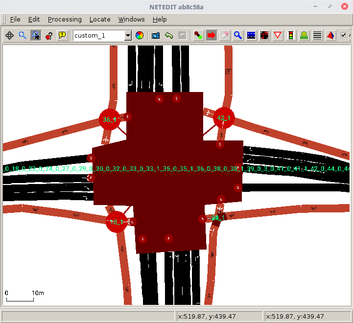 The edges are located upstream from the stoplines. We use different edges for ingress (incoming) approaches, egress (outgoing) approaches and crosswalks. De TLC is located in the middle of the intersection. There are 23 signal groups. The connections are lane-based. An ingress approach controls multiple signal groups and some signal groups have signal heads on multiple lanes.