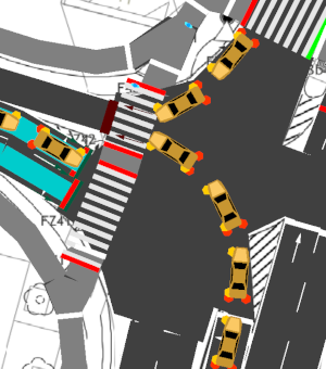 Recently, I switched to v.1.1.0 and rerun my simulation. All my detector evaluation showed very bad results compared to previous runs, reason being deadlocks created by turning vehicles blocking each other. It looks like that at least in the GUI (see below). Running the same sumocfg in v.1.0.1 does not lead to a deadlock. Has there been any significant change in intersection / vehicle dynamics?