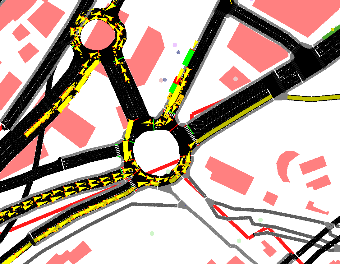 For Example: Have a look to the car in the roundabout down on the right side, which is not continuing driving. I tried to solve the problem with TLS in the roundabout, but unfortunately it didnt work so well.