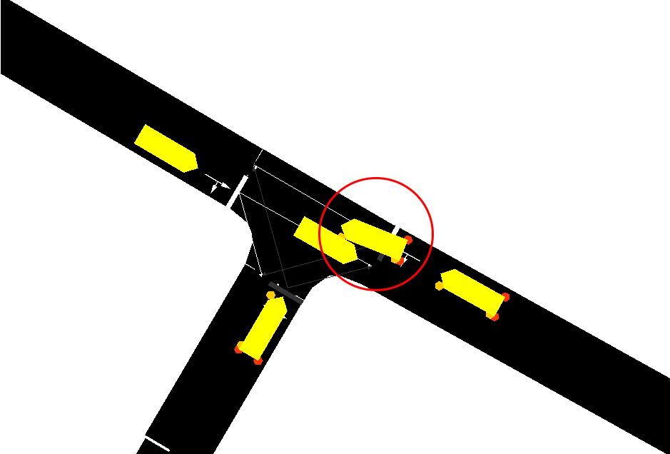 As you can see in the picture below, the encircled, left-turning vehicle is waiting for an oncoming vehicle which almost collides when passing by. Ideally, I am looking for an parameter to influence the offset, that let's vehicles stop more in advance and/or not let the vehicle turn less while waiting.