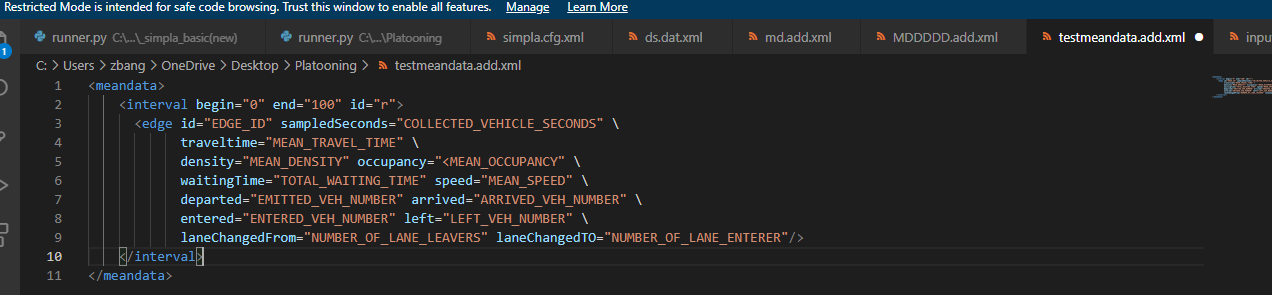 I initially tried to get the meandata file from netedit but eventually decided to use a text editor instead. Now I have it but I'm getting the error "attribute name expected" whenever I try to load it into the sumo-gui. Here's what I have so far. I'm guessing I have to change all of the values? Also, loading the data into the simulation is just the option "Open EdgeData" correct?