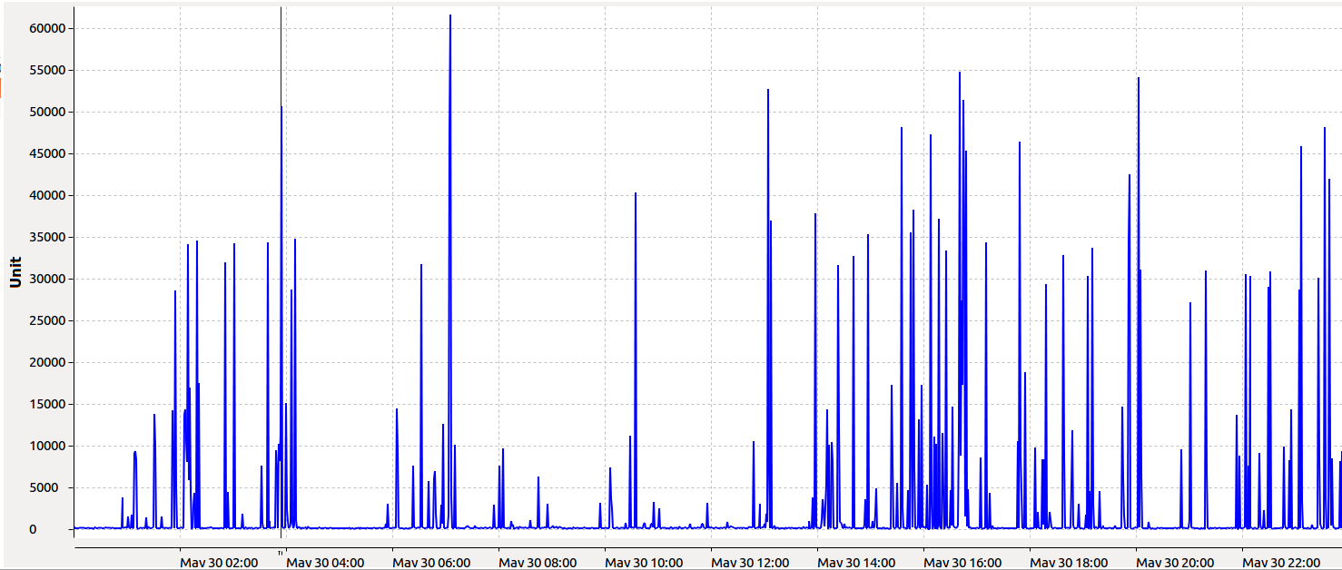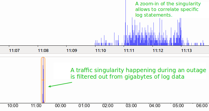 The scenario was a service outage of a Gerrit instance. Tracecompass allowed us to easily aggregate data from an upstream reverse-proxy and Gerrit. With this data in hand, and using custom filters as well as XML analysis, we traced-back to two causes for the outage. The first one was found while producing a graph of the duration that our server spent on honouring requests over time, per user (refer to figure 1). This graph allowed to establish that specific users were causing steep peaks in resource usage. The second cause was found while custom-parsing gigabytes of log data, and lead us to identify specific log statements that only happened during the outage (refer to figure 2).