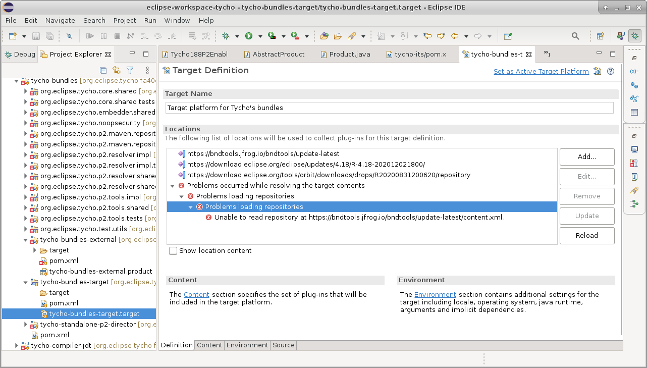 Here is a screenshot of the problem I have trying to load the target platform for tycho:
