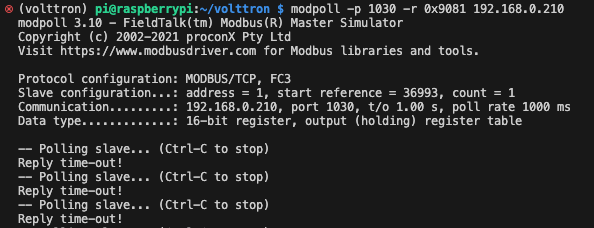 I am using Volttron 8.1.3 on a Raspberry Pi to coordinate the operation / testing of 2 devices over Modbus:
