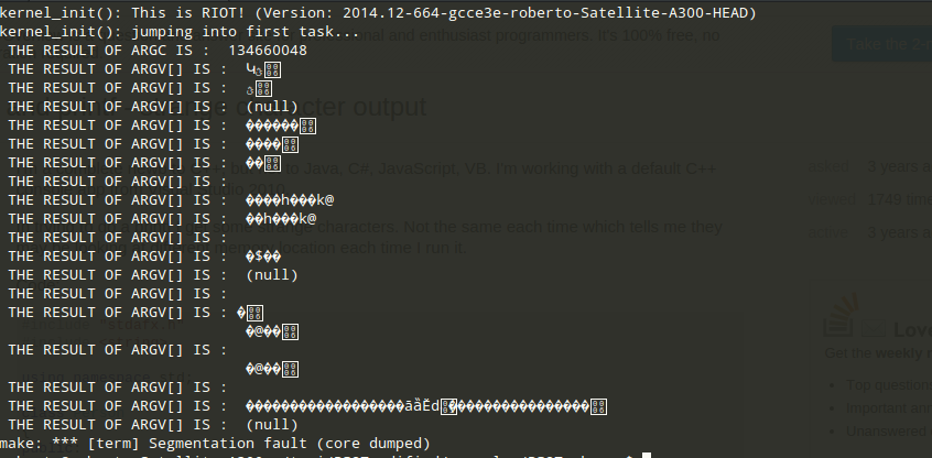 As far as argv is concerned I got these (see the screenshot) strange symbols as values: