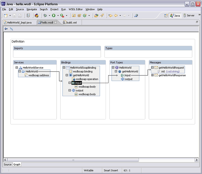The example includes a hello.wsdl file and shows an image of the file that it says was "generated from one of the web service components that is included as part of the Eclipse Web Tools project."  The image is shown below.  I went to the eclipse site to try to find a download of the needed components but can't seem to locate it.