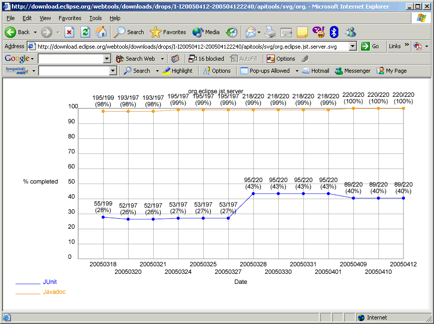 SVG graphics were recently added to the API Progress Reports (kudos to Jeffrey Liu). These display nicely in Internet Explorer, but you have to do some work to make them display in Mozilla Firefox, and the result is not good. My recommendation is to use IE until the Mozilla support is ready for prime time.
