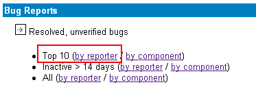 We've created a new link that shows the top 10 reporters with the most resolved, but unverified bugs that are older than 14 days. We'll be reviewing this list at tomorrow's status call. If you don't want to make the top 10 list, please take action now :)